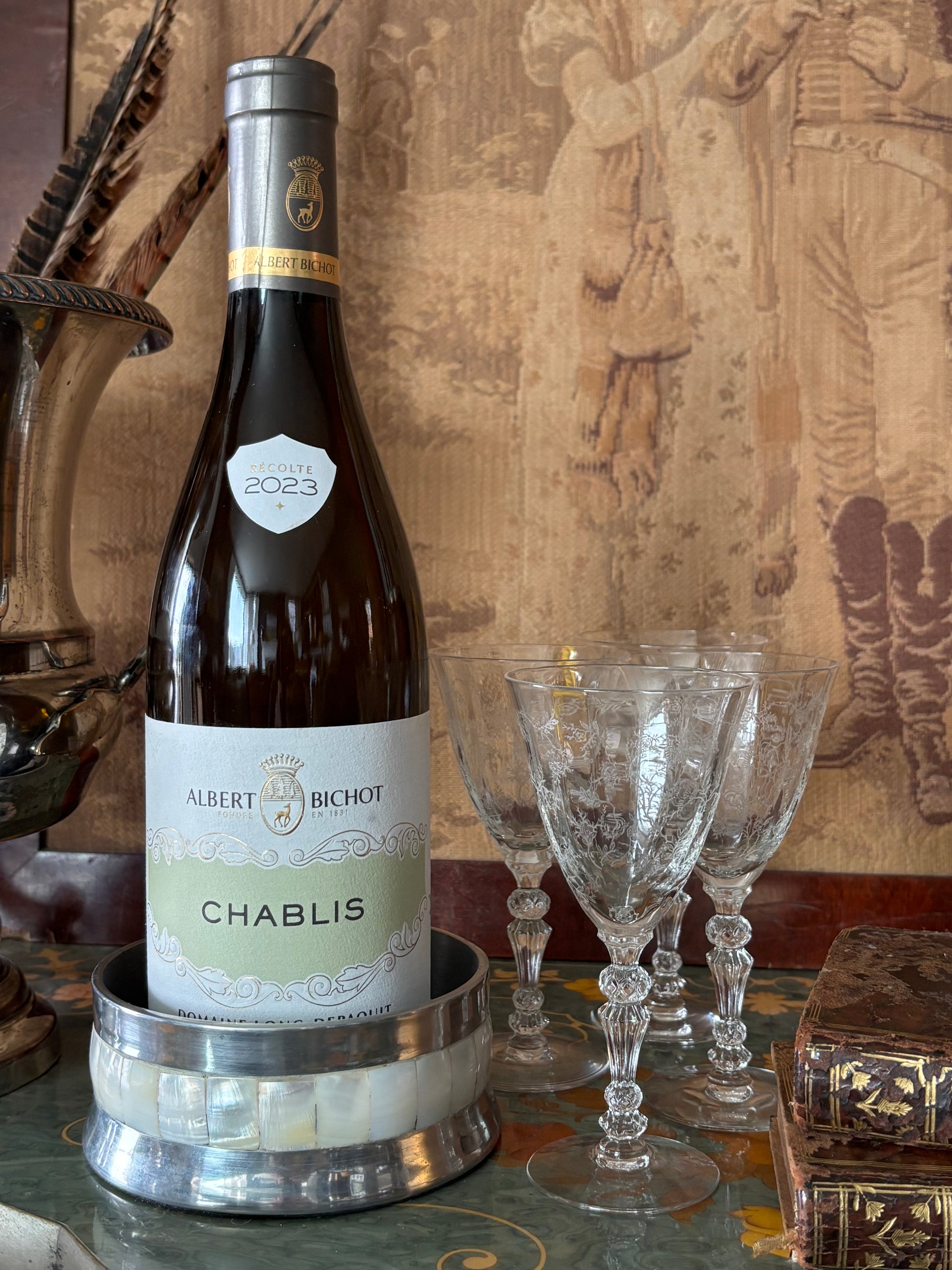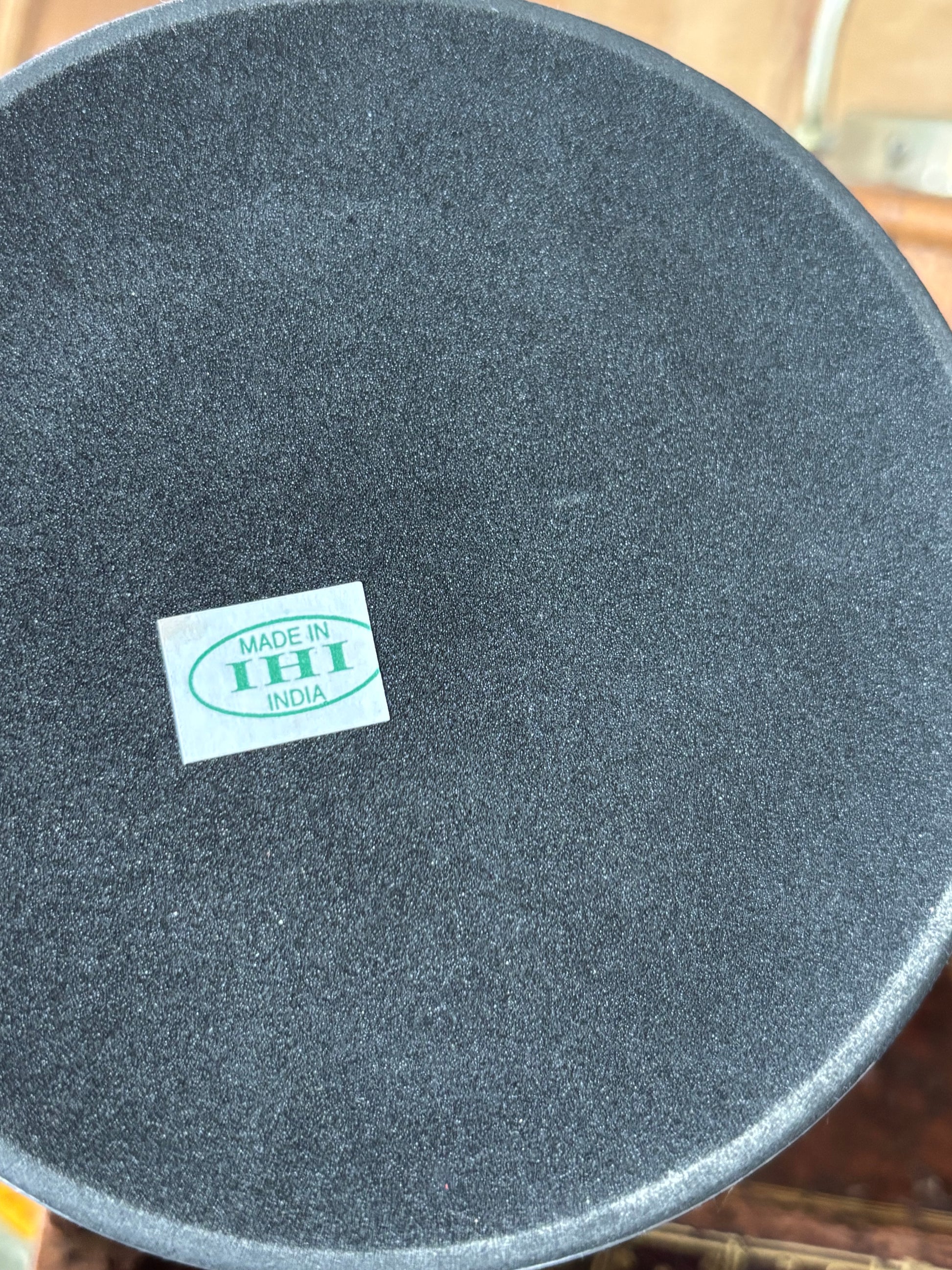 Elegant mother of pearl within a pewter coaster to hold a pillar candle or wine bottle. Soft black felted inside and bottom. Orginal label. This is more of a contemporary piece. 4.5" diamter x 2" t