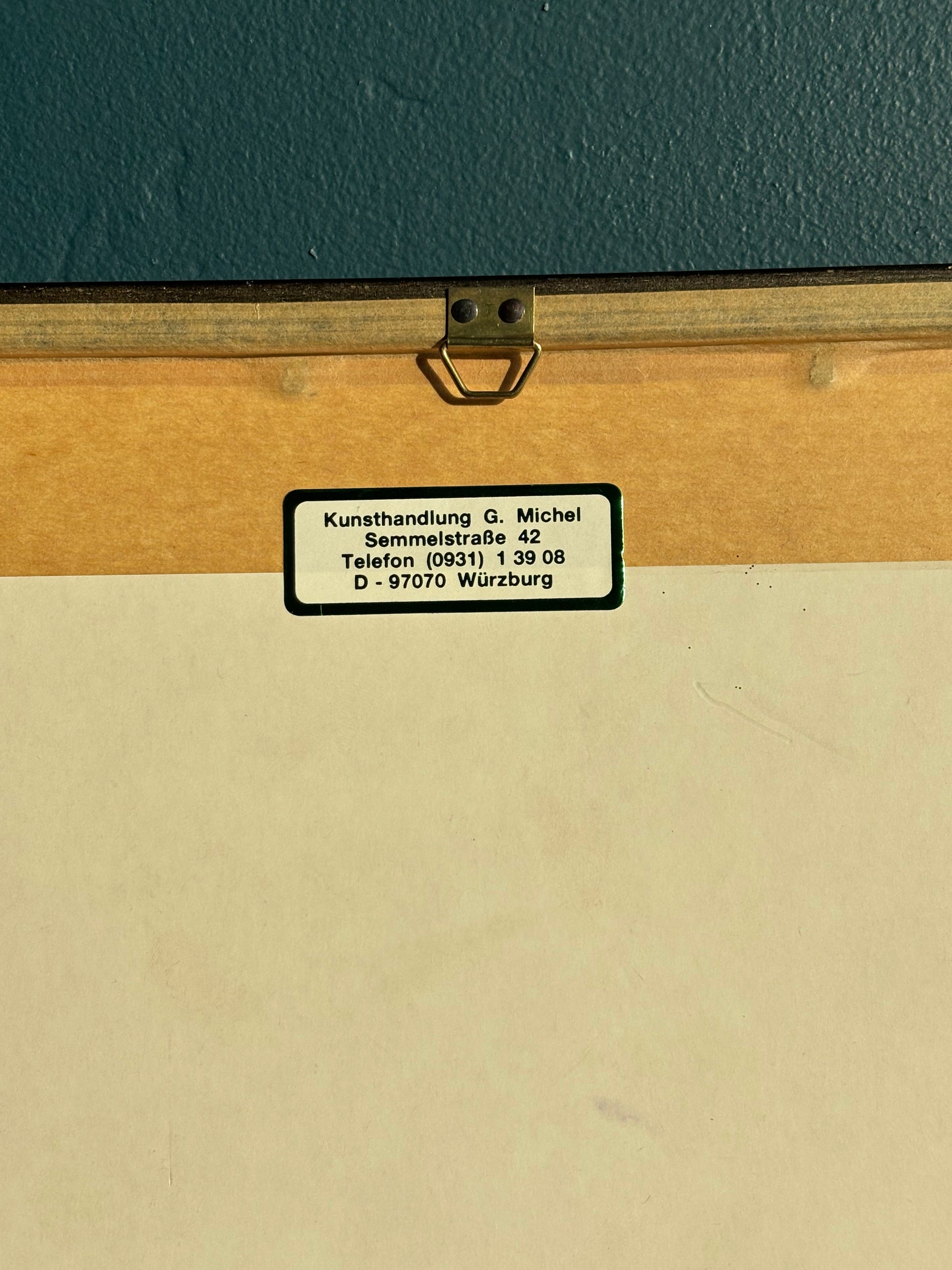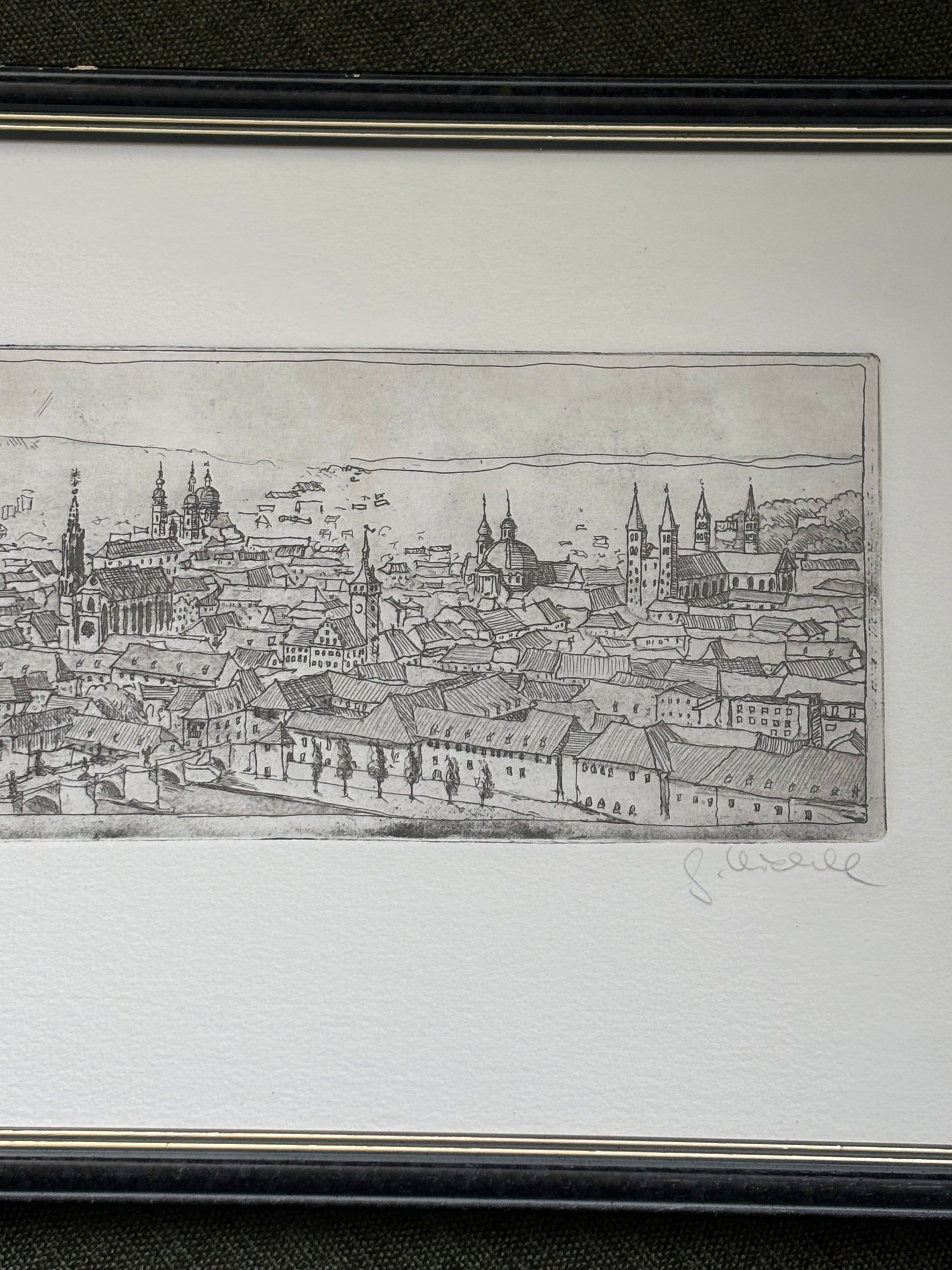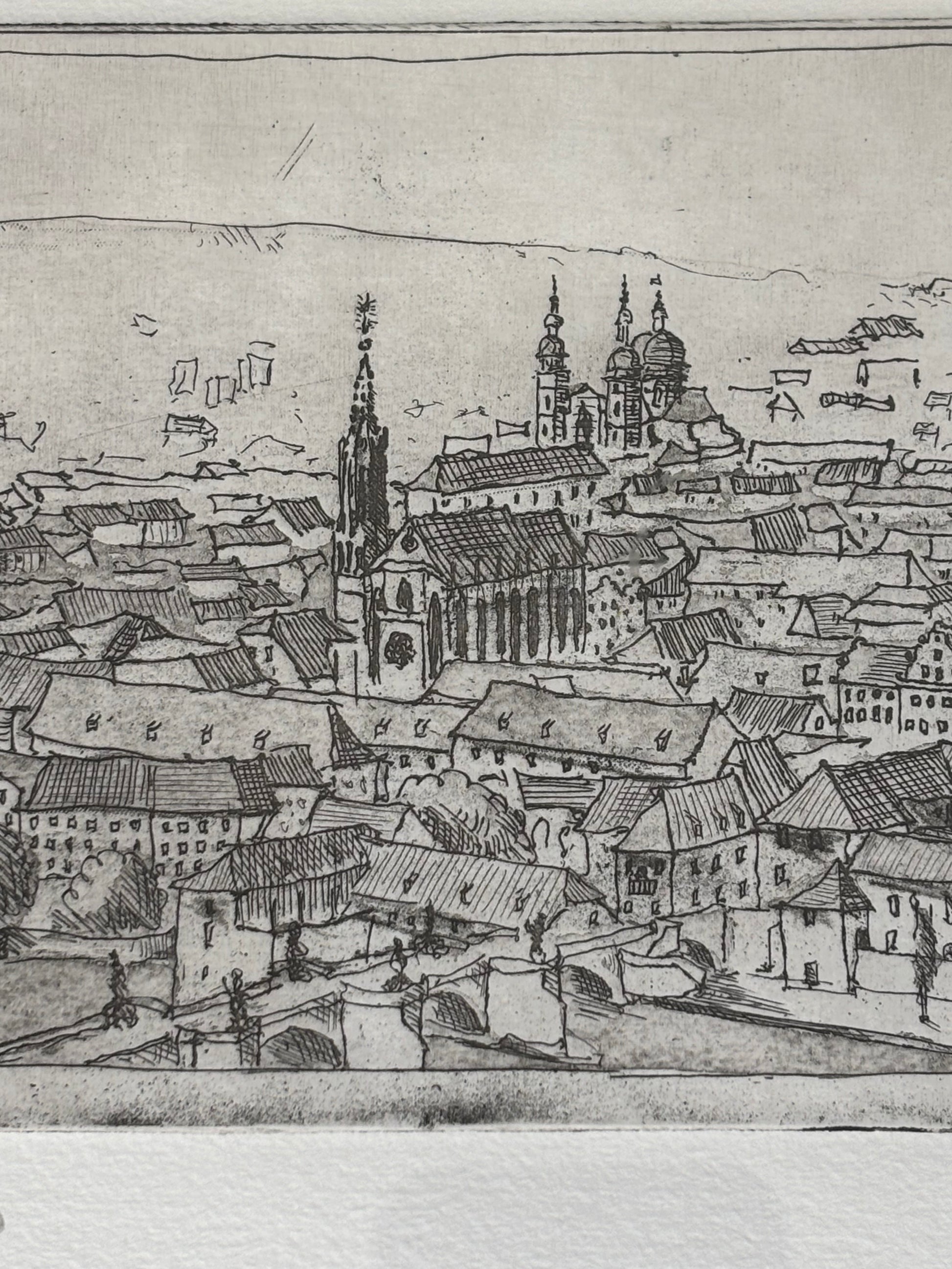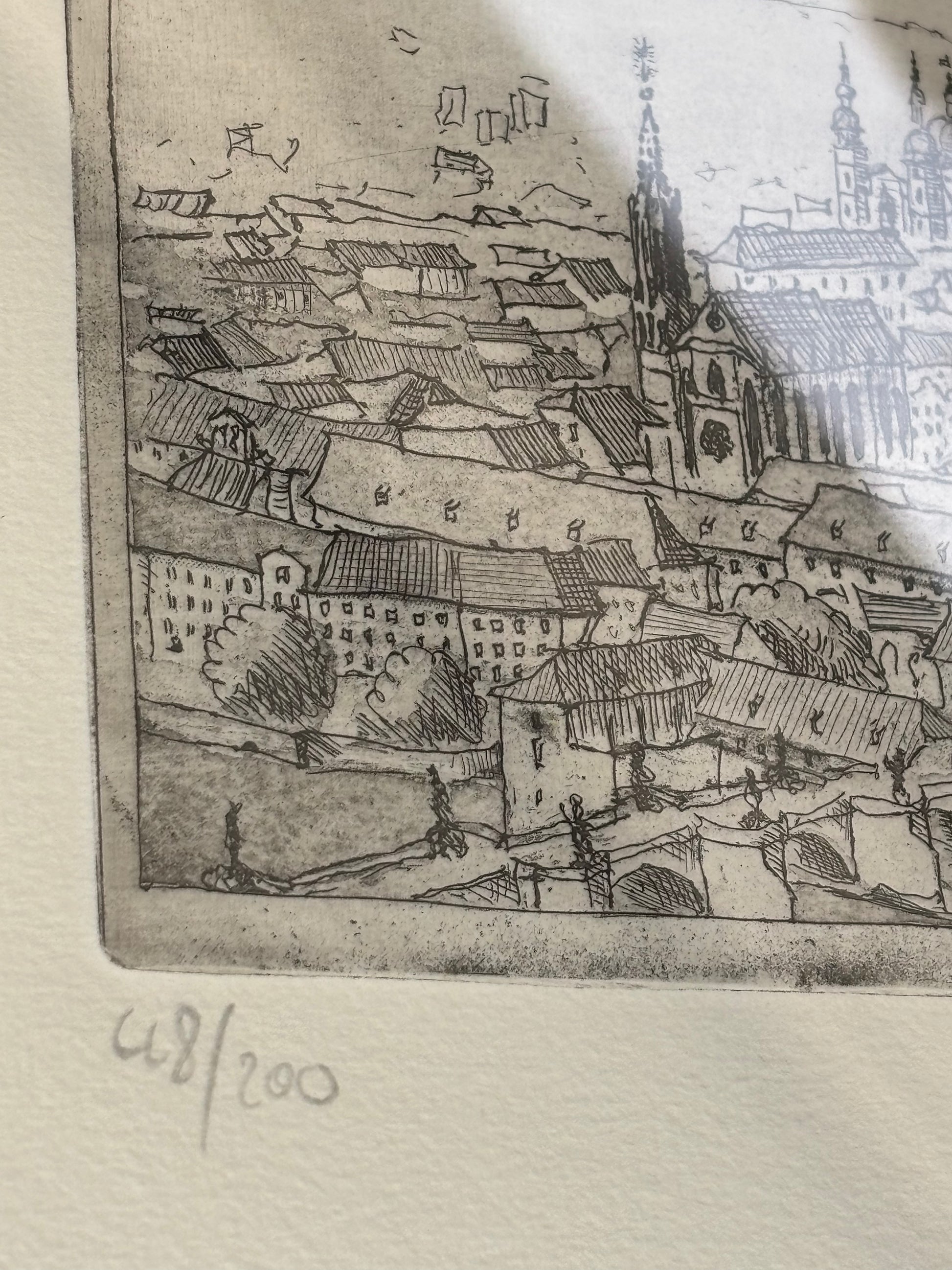 Prague cityscape engraving or etching (plate impression present) signed by artist in graphite and numbered. The St. Vitus Cathedral is featured on the left side in its beautiful gothic architecture. Professionally framed in West Germany with original frame shop label in back. Tape on back and ready to hang. Wooden frame shows some wear- see all pics. Wonderful size for a gallery wall or an easel. 13.5 x 9.5
